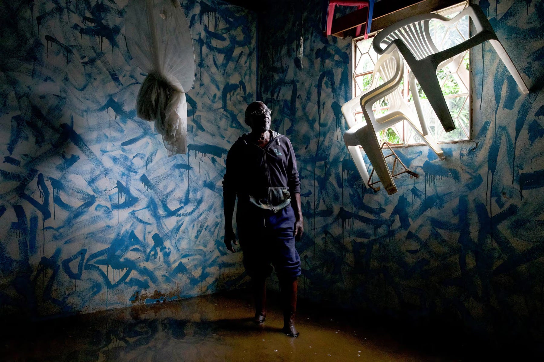 Water rises ankle‑deep inside a room that already looks half‑submerged in paint, the blue strokes on the walls reading now as tides and currents instead of decoration. The window is jammed with plastic chairs, absurdly suspended between inside and out, like improvised floodgates. Even the mosquito net, bundled uselessly high on the wall, reads as a white flag; the tools people once used to manage their environment are no match for an atmosphere that has slipped its bounds.