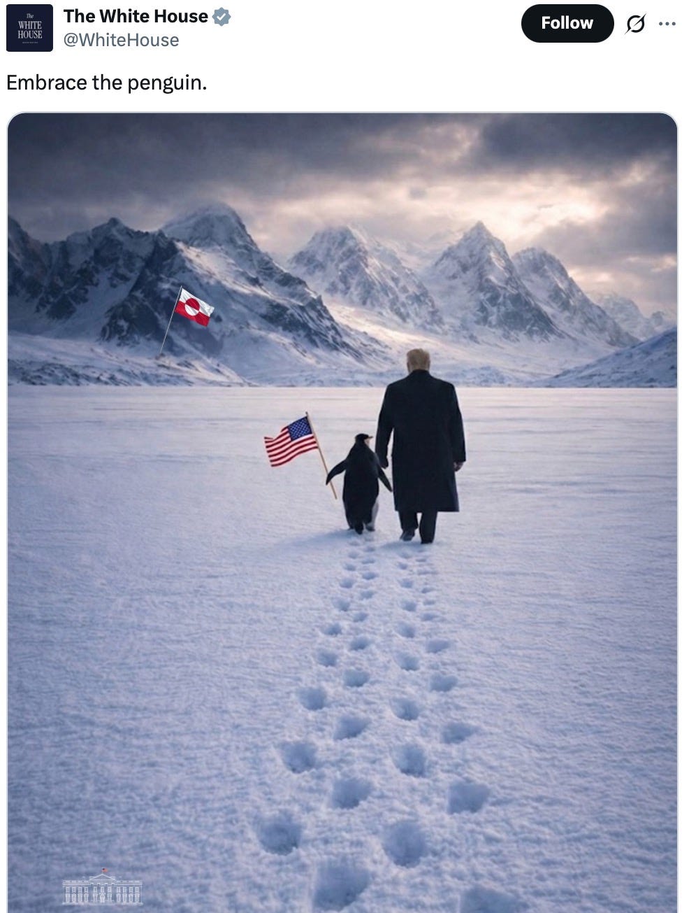 Then look at what the White House posted from Davos: AI-generated caricatures that turn the crisis, Trump’s gaslighting and threats, into propaganda poster kitsch. It’s contempt on every level—for the Danes and the Greenlanders whose sovereignty hangs in the balance, for the notion that foreign policy deserves anything more than comic book panels and burlesque, and for visual communication itself.