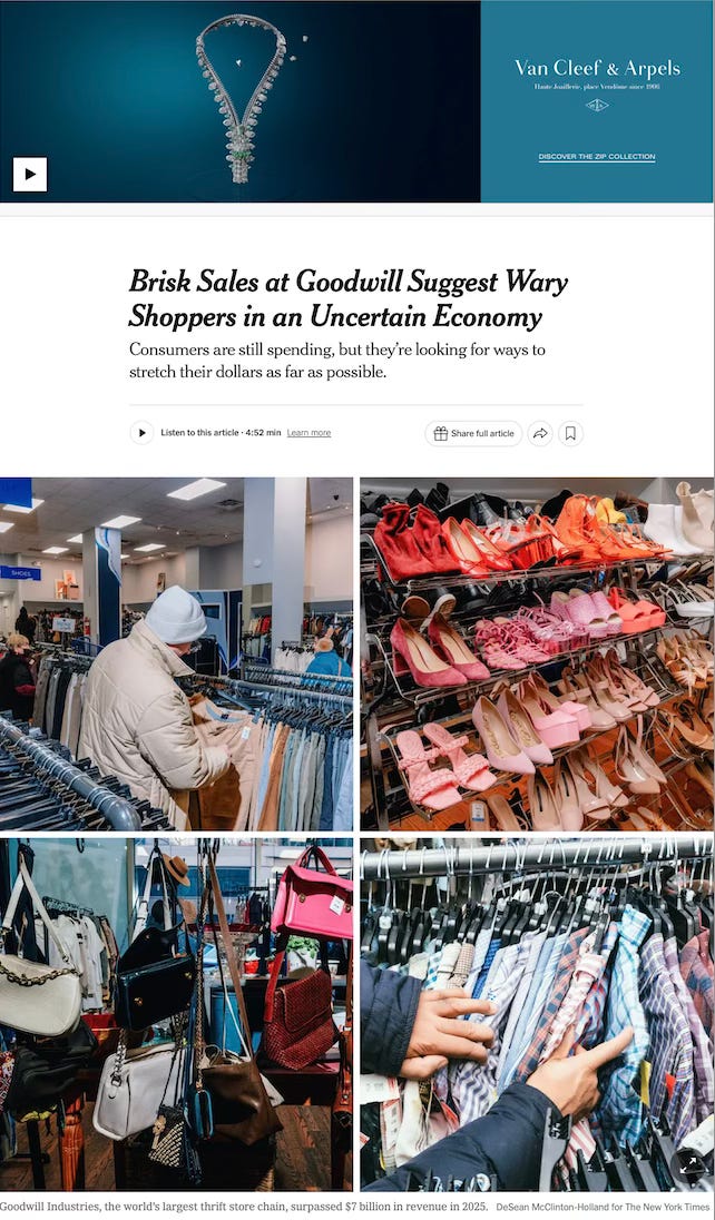 How sad is the ad fed to this New York Times article? The juxtaposition perfectly captures how a piece about ‘brisk’ Goodwill sales in a shaky economy gets framed for the comfort of the well‑off. Set against a luxury‑jewelry banner, the thrift racks and bargain hunters become scenery in a matter-of-fact business story, and the pairing all but turns both into poverty porn.