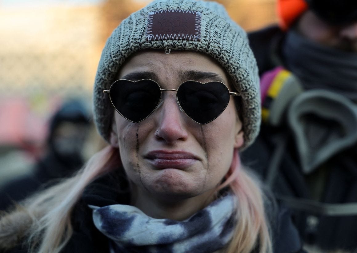 Evelyn Hockstein’s photo lays bare Minnesota’s grief over the murders of Renee Good and Alex Pretti, and the violent occupation of their city. The mascara running down her face makes the heartbreak unbearably immediate, while those heart-shaped glasses, the peace-and-love aesthetic straight out of the ‘60s, connect this moment of anguish to another generation’s resistance to war and state violence.