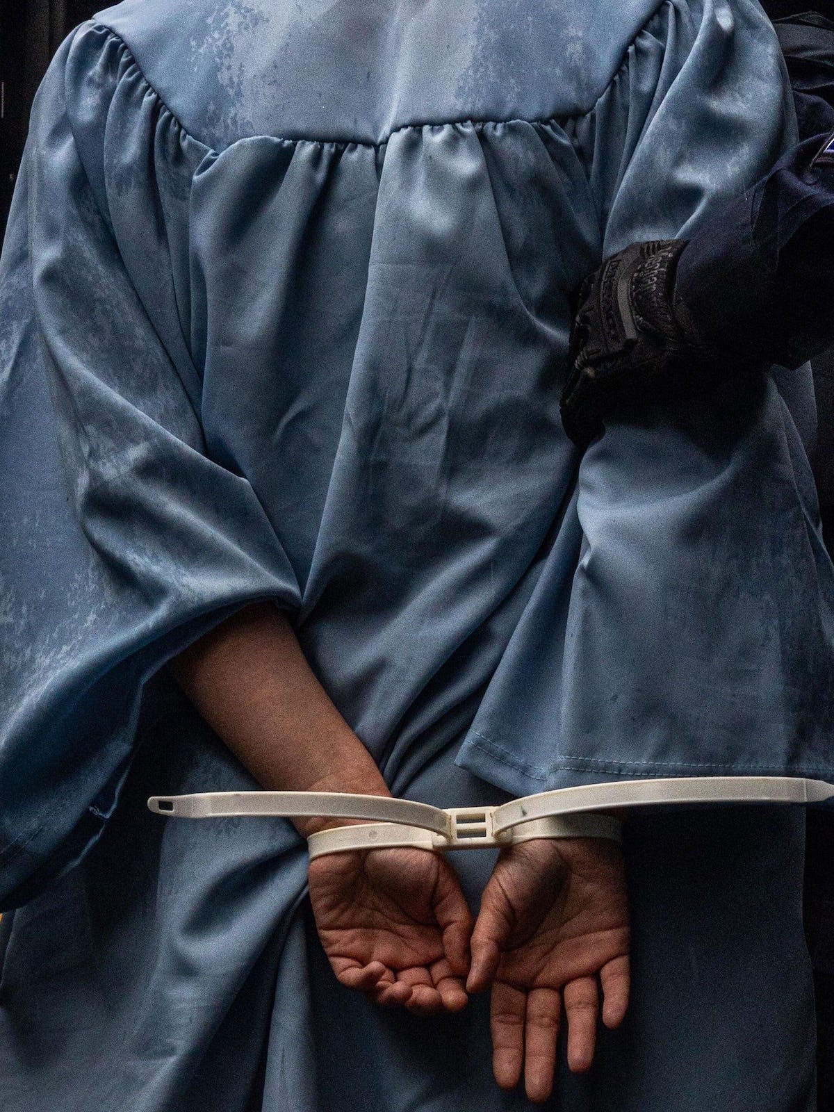 Columbia University alumnus Jess Pearce is arrested during a protest outside the campus during the university’s graduation ceremony in New York City on May 21. Alex Kent-The New York Times/Redux