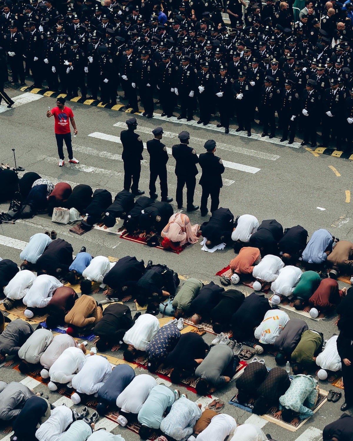 People pray outside the Parkchester Jame Masjid mosque during the funeral for NYPD Officer Didarul Islam in the Bronx, on July 31. Amir Hamja-The New York Times/Redux