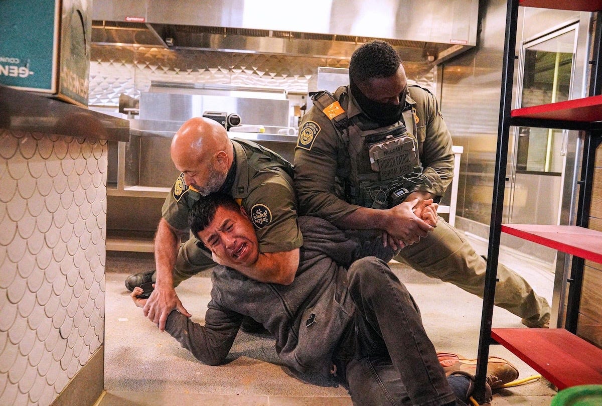 A person is detained by U.S. Border Patrol agents inside a fast food restaurant under construction in Charlotte, N.C., on Nov. 19. The man sustained injuries to his face while agents wrestled him to the ground after he tried to run. Federal Agents are carrying out “Operation Charlotte’s Web,” an immigration enforcement surge across the Charlotte region. Ryan Murphy-Getty Images