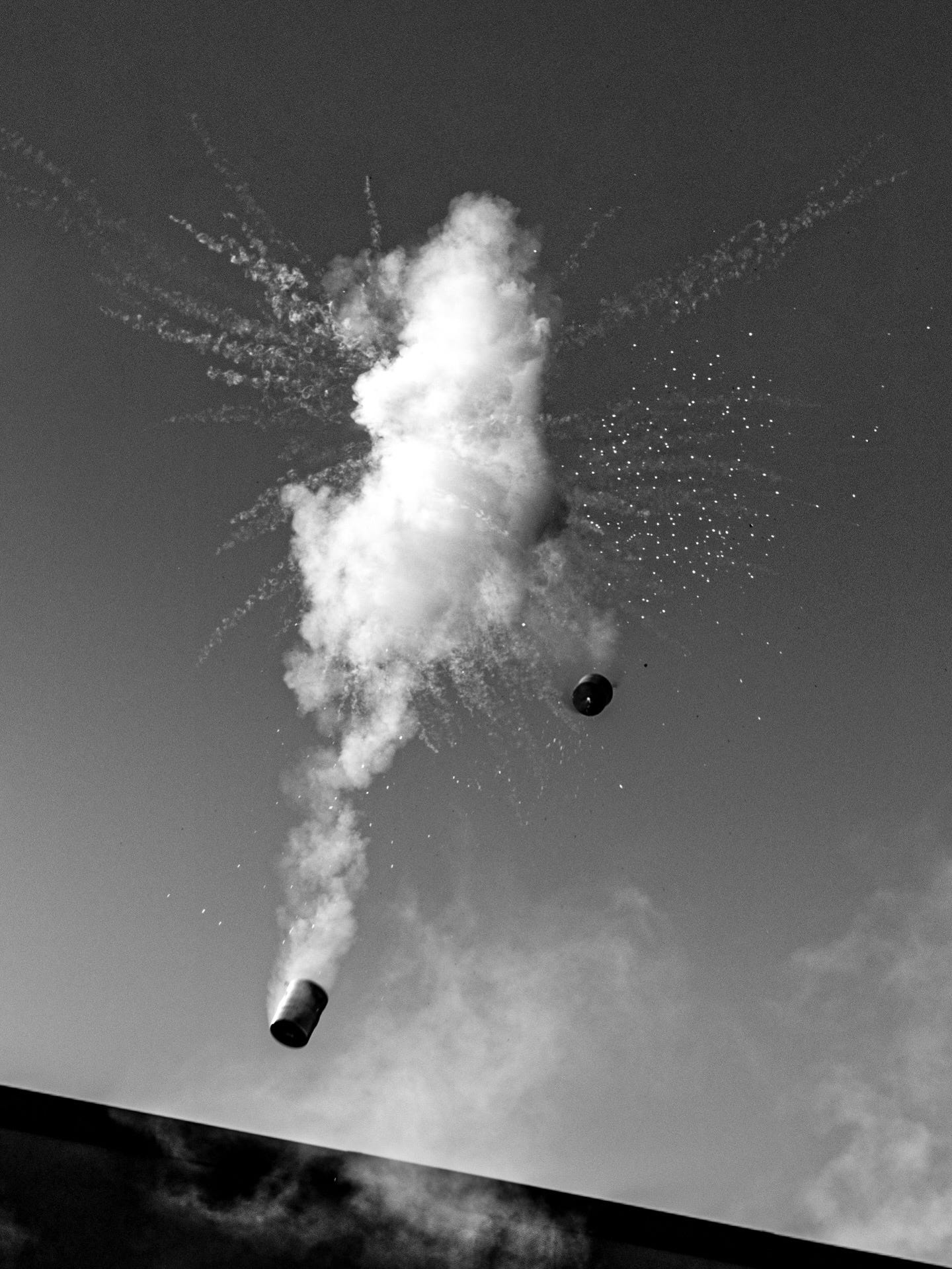 The canister suspended in the air—mid‑arc, mid‑detonation. The documentary distance lets us study the moment almost clinically. That clarity cuts against the chaos the violence intends. The shock and awe, the ‘flooding the zone,’ are designed to traumatize—to make thinking impossible. The freeze-frame, instead, lets us process the fireworks rather than absorb their impact. It’s a portrait that says to Trump, Miller, and Noem: we get what you’re about.