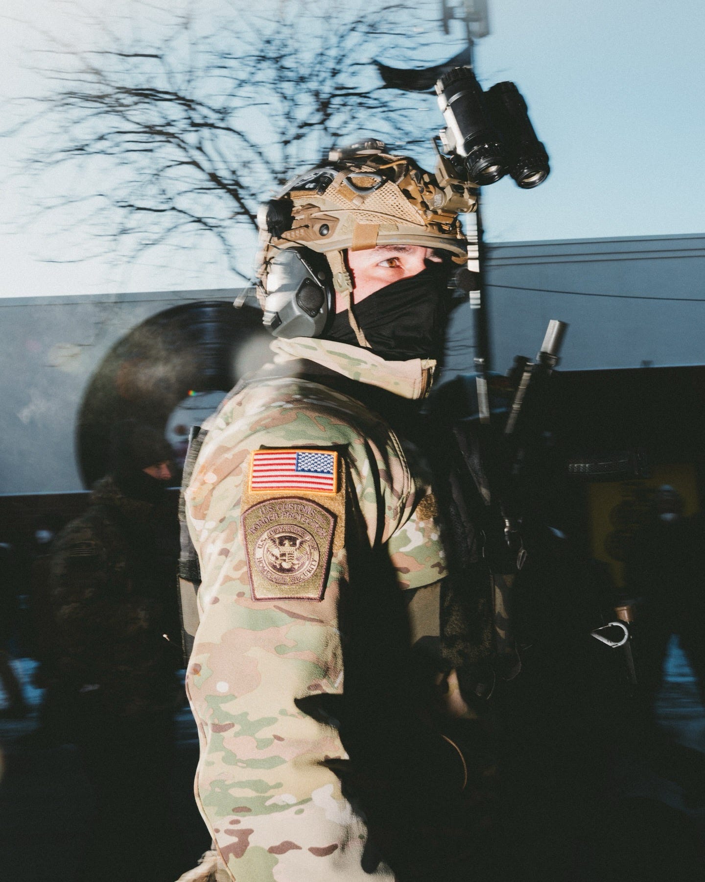 Philip Montgomery’s photograph captures an ambient terror spreading far beyond the streets where the agents actually operate. A person stands at the window, caught between private and public, safety and threat. Her gaze aligns with the camera, not on any federal presence off‑frame.