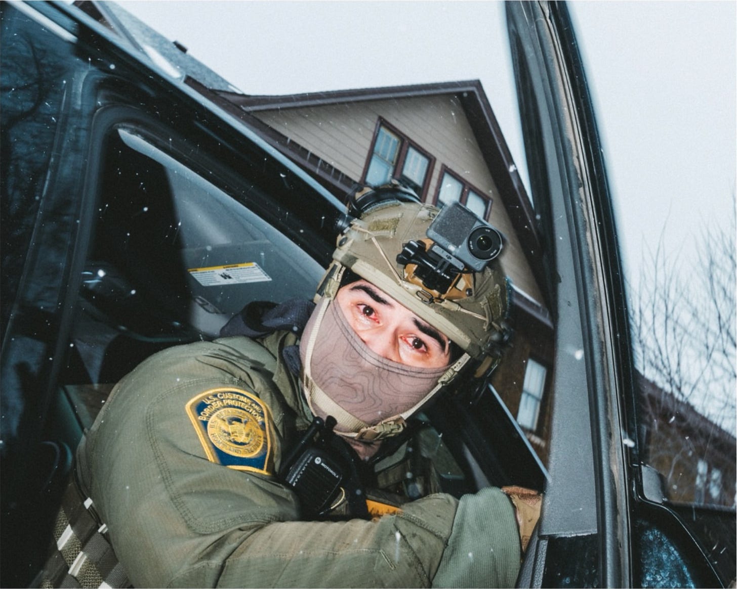 Talk about a photo that goes the other way. The vulnerability in this agent’s body. The fear in his eyes. The sheerness of the mask, more like lingerie. Where the troops are largely untrained, barely managed, and operating with little plan, many of them are simply scared to death. Undermining the sense that Trump’s enforcers are all attack dogs and soldier‑of‑fortune types, this image captures a deeper truth: they—like the citizens hunted at their car doors—are equally caught in the crossfire.