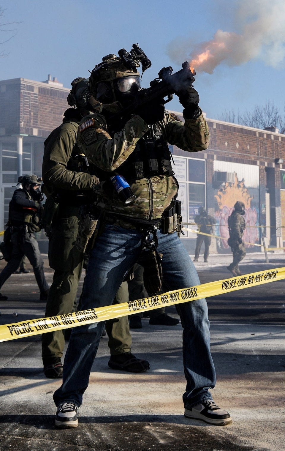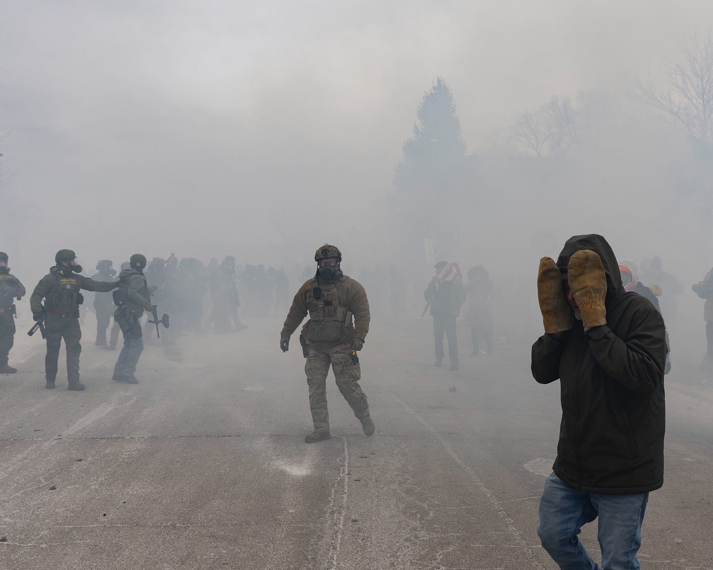 A federal agent is firing tear gas into a crowd. The visual grammar is combat: obscured sightlines, tactical aggression in urban terrain, and chemical weapons deployed against civilians. The fog—literal and figurative—shrouds what’s happening in the language of war. You could be looking at Gaza, Fallujah, or any number of conflict zones. Except this is Minneapolis.