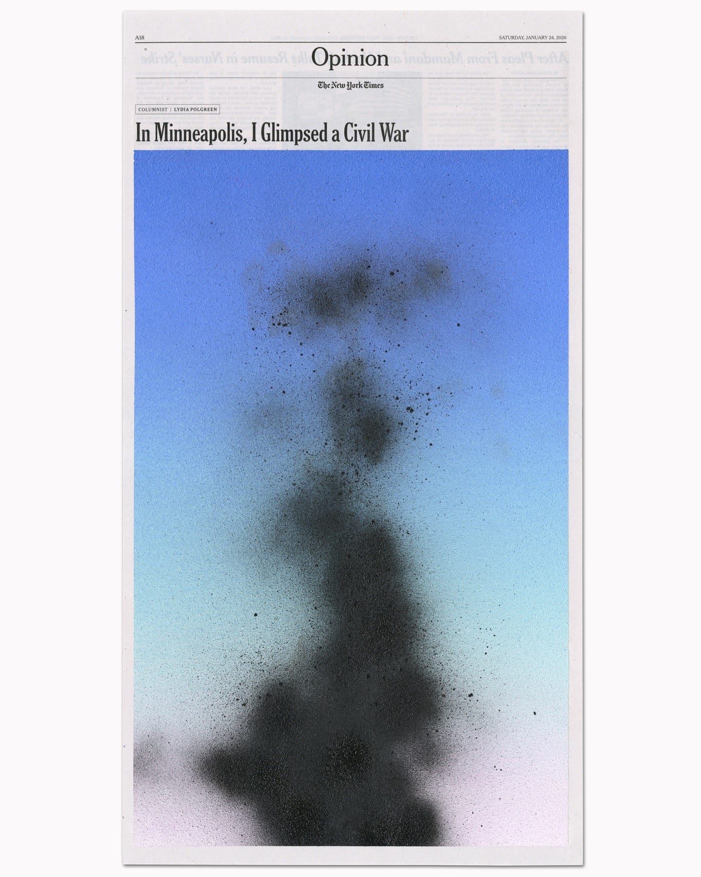 The artists Shoshibuya gets it. His latest interpretation of a New York Times Opinion page not only captures the smoke from the attack on Minneapolis, the blotches of paint like shrapnel, but he “publishes” the words the media, like The Times, will not use.