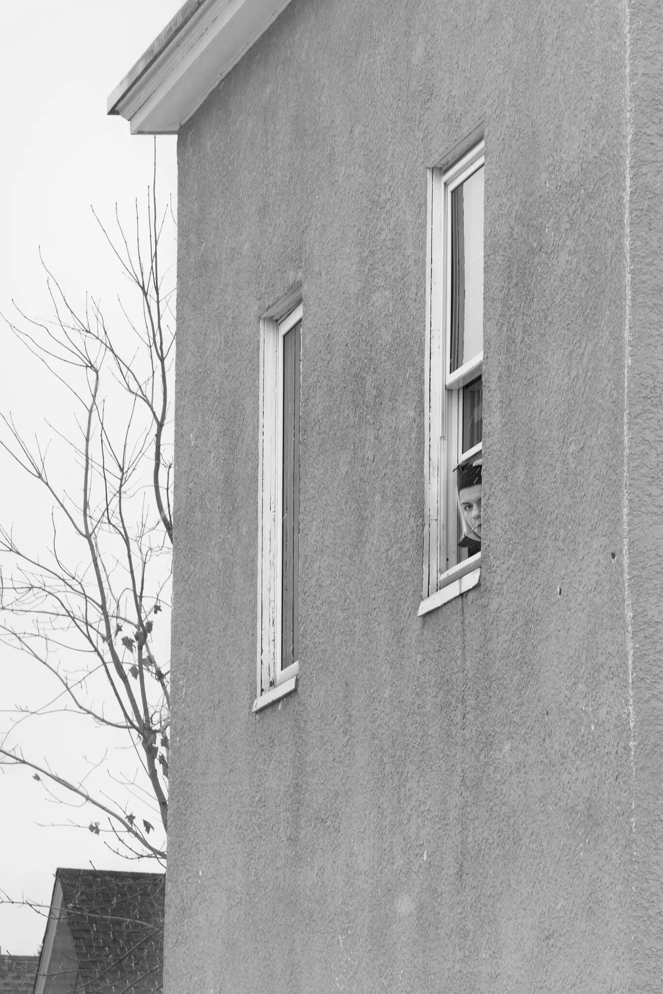 The window frame matters. In war photography, windows and doors often mark vulnerability—the moment before breach, the boundary that won’t hold. Montgomery places the figure squarely inside that frame, making the psychological operation legible even when no agents appear in the shot.
