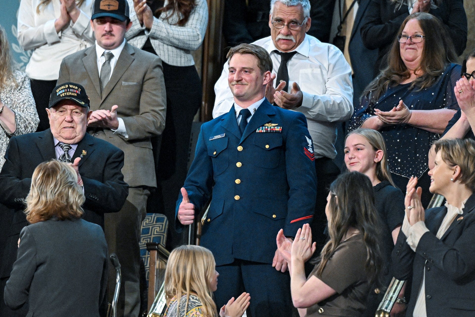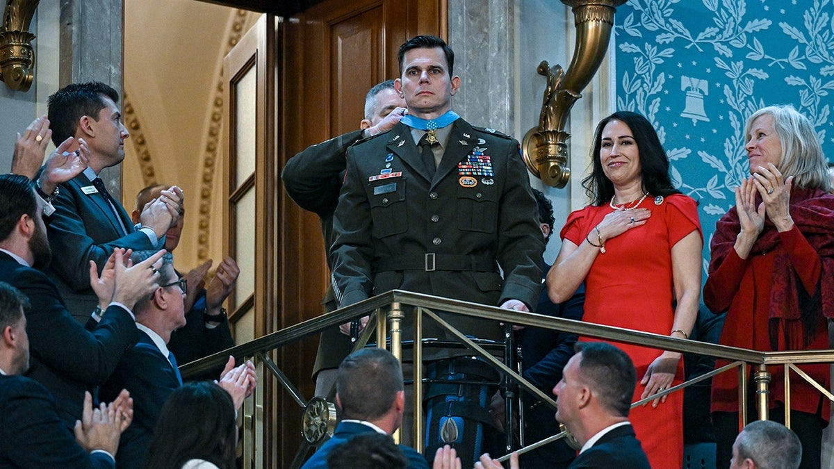 There was Marine Corporal Kenton Slover, standing at attention as he was praised for his valor; retired Navy pilot Royce Williams, saluted as a living legend from another era; Army veteran Shane Taggart, hand over heart in a tight salute, and Coast Guard Petty Officer, honored for rescuing people from deadly flooding.