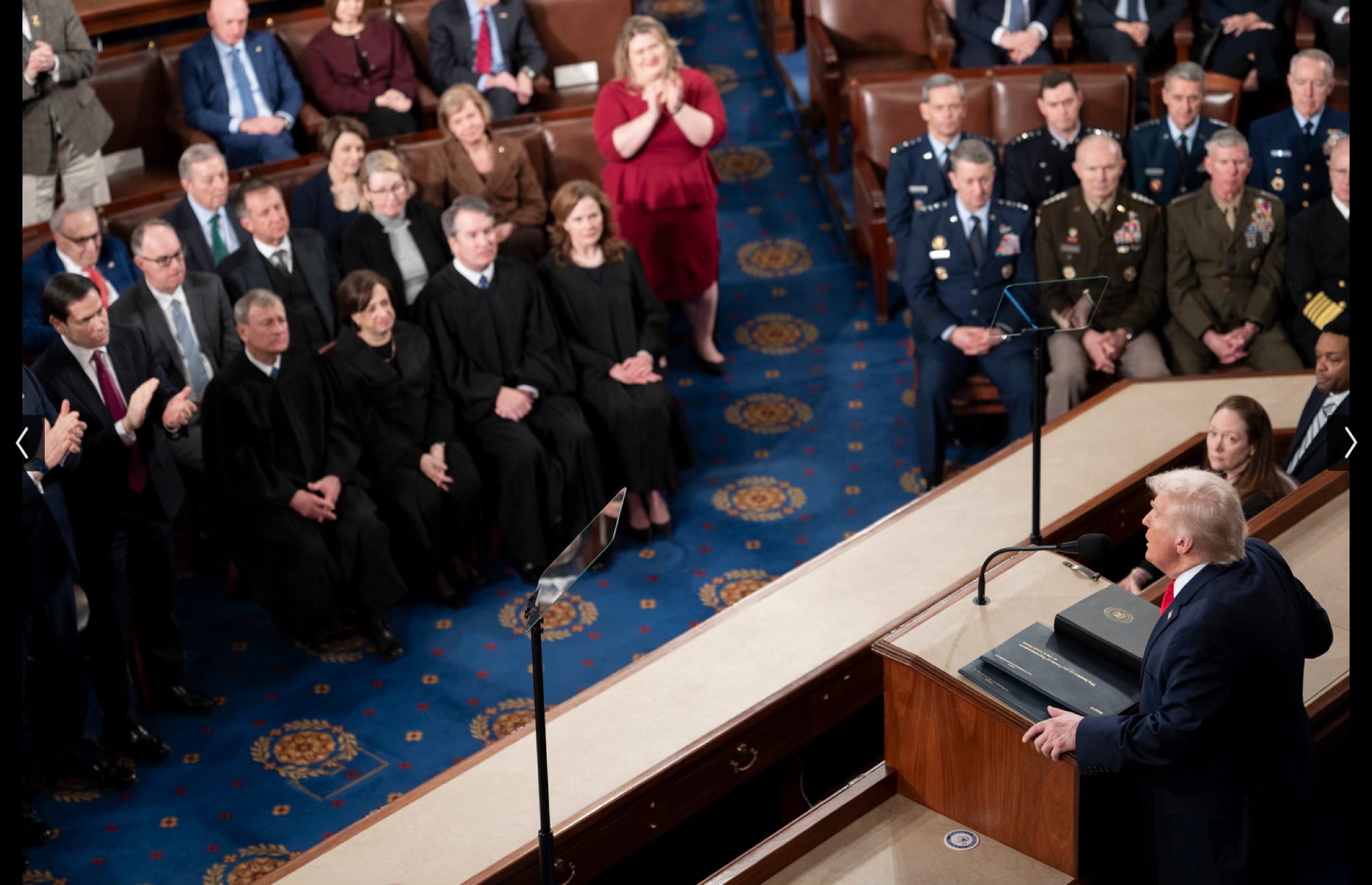 One wire photograph places Trump alongside the Supreme Court justices and the Joint Chiefs — a formal picture that still gestures toward the constitutional order: the judiciary, the legislature, the executive, the military, all in one frame.