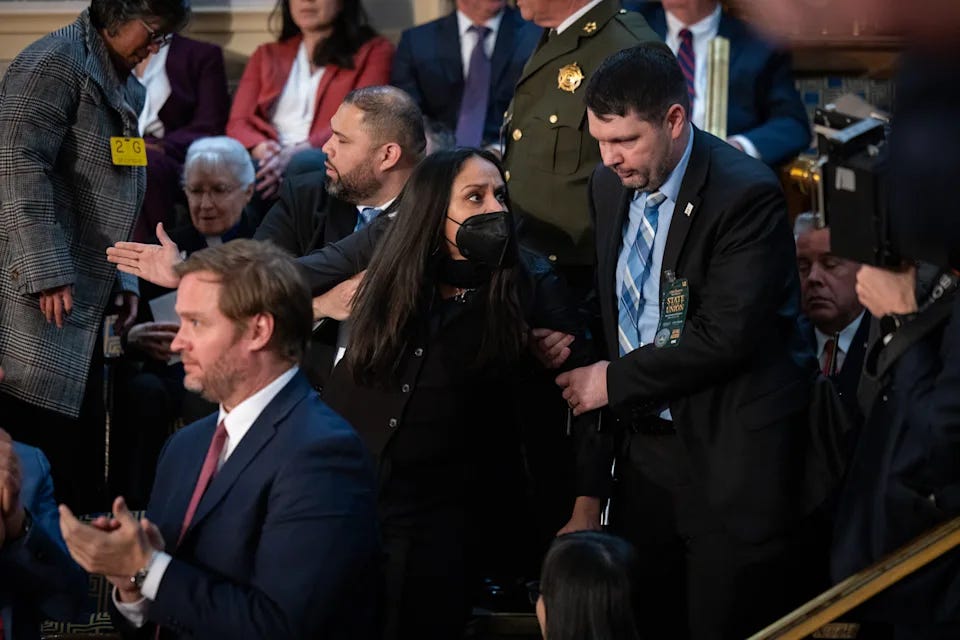 Representative Green was also ejected from the previous year’s SOTU for protesting — and the press and the GOP spent more time amplifying his breach of decorum than the what or the why. The fact that he was largely ignored this time is arguably worse.