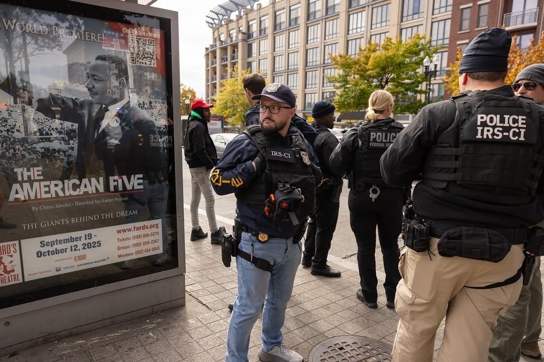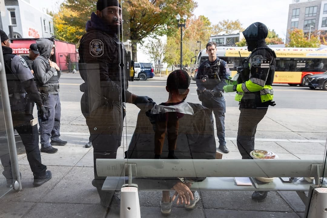 Allison Shelley recorded these scenes on October 29 at the Georgia Ave/Petworth Metro in Washington, where the absurd deployment of IRS Criminal Investigation Special Agents—typically tasked with financial crimes—had devolved into pulling people off buses for fare evasion. One photo shows a Black man sitting in handcuffs on a bench.