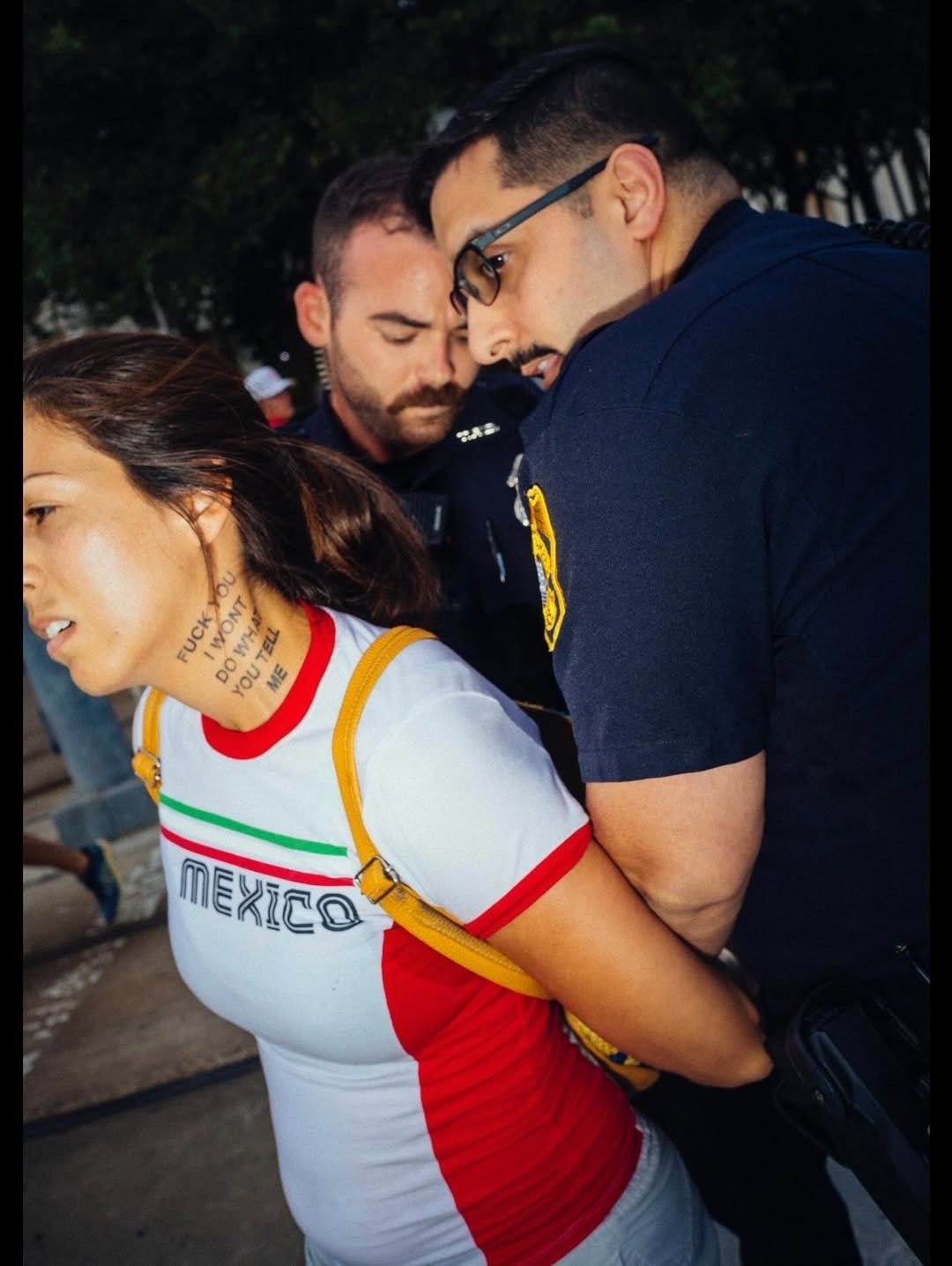 She’s literally sticking her neck out—the most vulnerable target bearing the most defiant message: “FUCK YOU, I WON’T DO WHAT YOU TELL ME. When speech brings consequences, the neck becomes both a billboard and a bull’s-eye. Rage Against the Machine’s lyrics are etched into the flesh, leaving the body as a permanent testament.