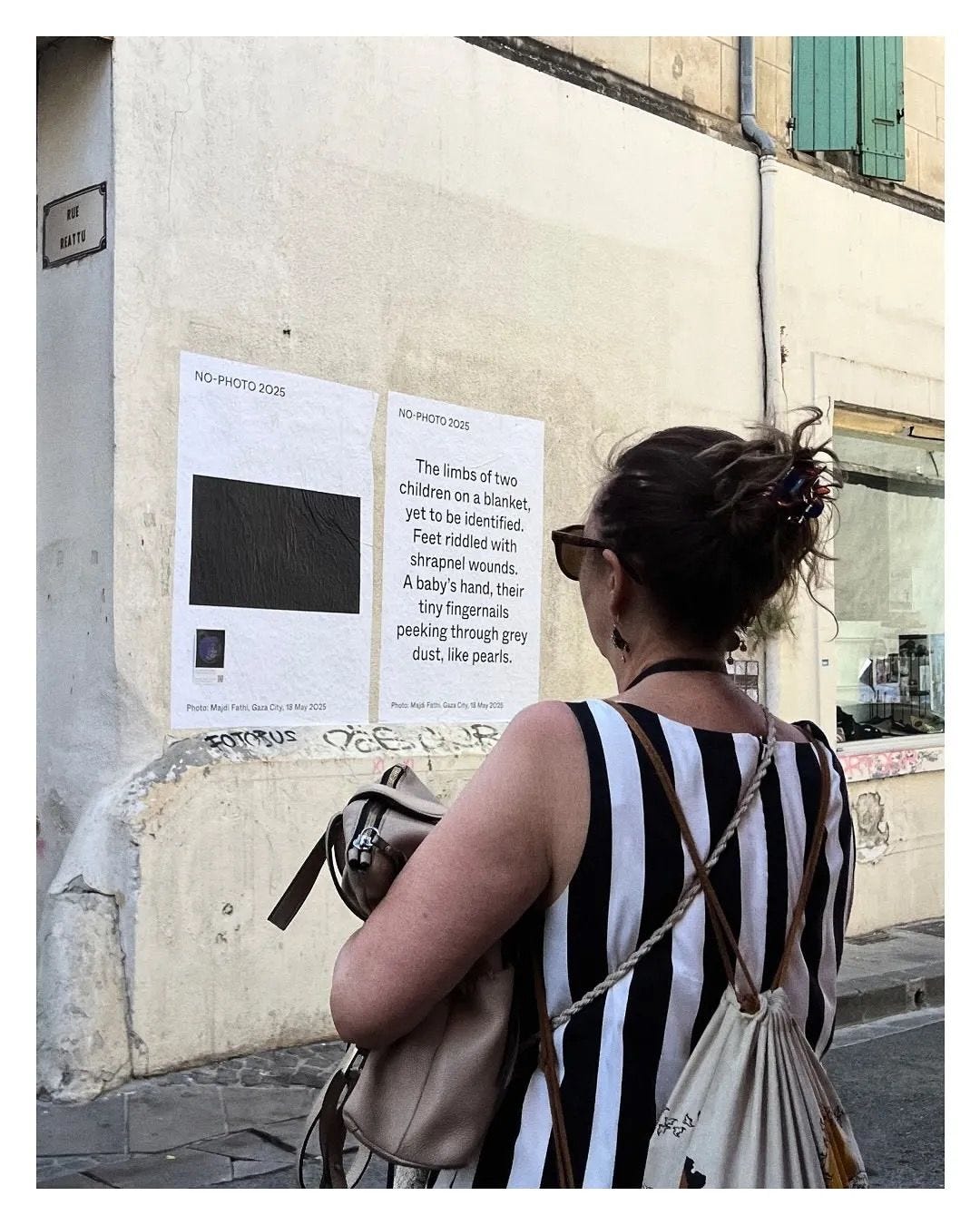 NO-PHOTO 2025, a guerrilla intervention at the Rencontres d’Arles photography festival, pasted black squares with photo credits throughout the city. Each displayed a text description.
